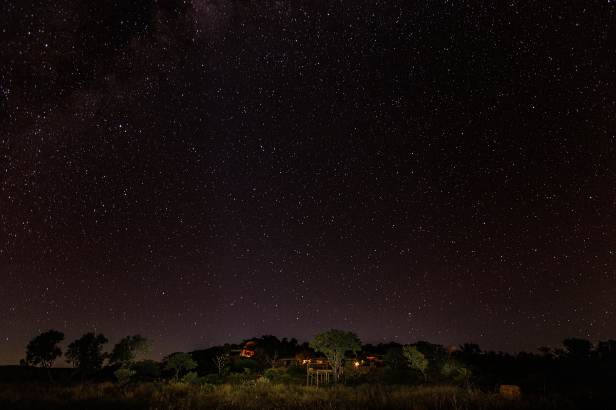Star-filled skies are seen above a lodge and natural landscape of Lapalala Wilderness